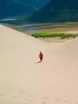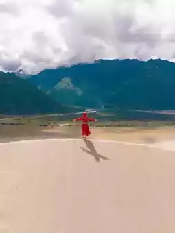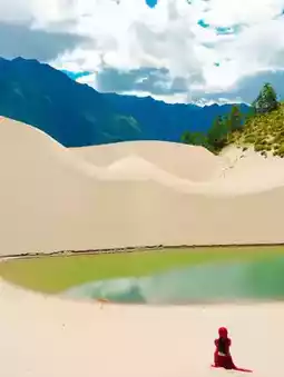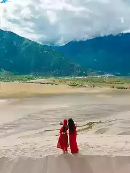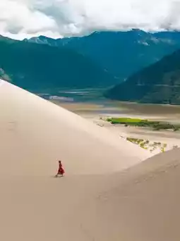Deserts and Tibet are rarely associated with each other, but here is the Fozhang Sand Dunes located in Nyingchi. If you're lucky, you can see snow-capped mountains, lakes, deserts, and forests 🌳 all at once. Truly breathtaking!!! The red dress looks amazing in photos, so beautiful. If you come to Nyingchi, Tibet, you must visit here. Fozhang Sand Dunes