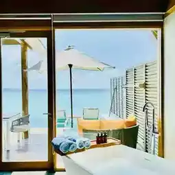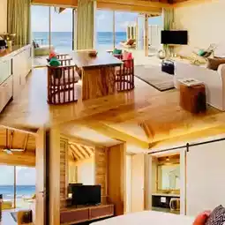 The design belongs to the wooden style πͺ΅οΌ Simple and atmospheric, the room area is large and can accommodate 3 large and 1 small or 2 large and 2 small. The water house is also equipped with a private swimming pool, a sea view bathtub, and a terrace lounge chair. Lying in bed, you can enjoy the stunning sea view π The spare parts are very complete, including toothbrushes, toothpaste, and razors, so there is no need to prepare them yourself. But rooms near the shore will have a breakwater, which needs to be noted