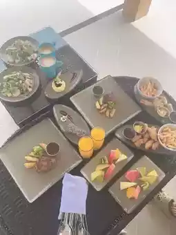 The overwater restaurant, Azzurro, serves a buffet breakfast, but the local flies can be a nuisance. Lunch and dinner are à la carte with a three-course menu, including a children's menu. For families, it's recommended to order from the adult menu, except for the chicken fingers on the kids' menu. The restaurant offers a convenient QR code menu with a Chinese translation. Additionally, there's a complimentary room service option available once a day, which we utilized to enjoy a meal on our water villa's upper deck.