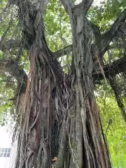 The image captures a serene urban landscape in the Maldives during its perpetual spring. The focal point is a modern, cylindrical building with numerous tiers of windows reflecting the soft, overcast sky. This contemporary structure is nestled amidst a surprising abundance of lush greenery, showcasing the unique blend of urban development and tropical nature characteristic of the islands.