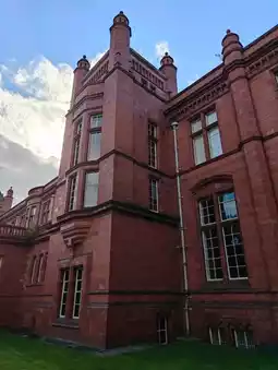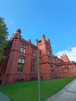 The Whitworth Building, nestled within the University of Manchester, stands as a quiet masterpiece of civic architecture. Its brownish-red façade glows warmly against the city’s changing skies, a rich palette of terracotta and sandstone that feels both historic and inviting. The design is grand without being imposing — symmetrical, stately, and softened by leafy surroundings.