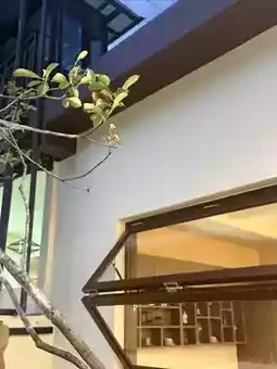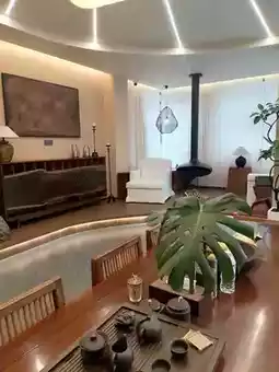 -- Precious solid wood furniture everywhere highlights quality. After moving in, chatting with the host and the housekeeper, I learned that all the furniture is made of precious solid woods like golden phoebe, teak, old elm, and black walnut. Especially the large tea table in the lobby, the host said it’s a whole board of golden phoebe imported from Myanmar over ten years ago. It had been used at home all this time, and when the homestay opened, it was placed in the lobby (I must say the host is really generous [Joyful]). Also, the large burl wood stump by the lobby’s floor-to-ceiling window is very artistic. The courtyard’s highlight—the island gardenia—is also in bloom.