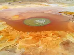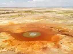 Aiken Spring, known as the "Eye of the Devil," is a miracle in the desert—a bizarre and captivating landscape. From afar, it resembles a quietly opening eye; a closer look reveals the various layers of color reflected in the water. The vibrant colors in the desert guarantee a 100% success rate for photos. However, be aware that due to the unique geology and saline-alkali deposits in this area, there isn't much greenery. Be careful to avoid slipping and protect your shoes when walking.