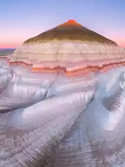 Located on the Mangyshlak (Mangystau) Peninsula by the Caspian Sea, these surreal, multi‑layered chalk hills—nicknamed “Tiramisu”, Mount Bokty/Bokhty, or Bakty Mountain—resemble a layered cake painted white, red, yellow, coral, and ochre.