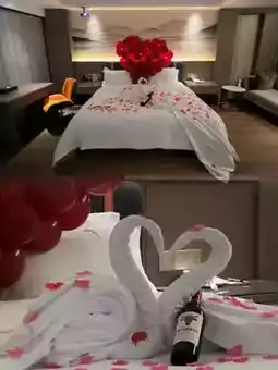 The moment you step into the room, you're surrounded by love - giant heart-shaped balloons with "The universe's ultimate romance" written on them, swan-shaped towel art and rose petals covering the bed. The atmosphere is perfect, the sense of ceremony is off the charts, and it's super photogenic 📸