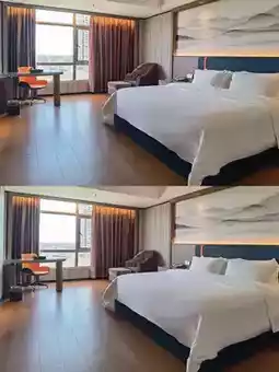 √ Executive king room on floors 13 to 16: 180° panoramic floor-to-ceiling windows with views of Dianbai city at night.
