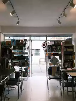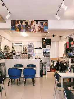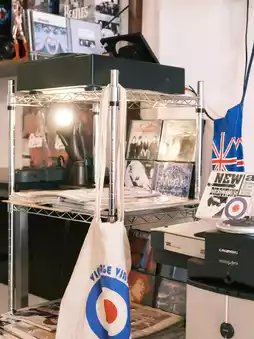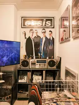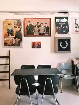 The space is filled with rock band albums, posters, and an analog audio system. Its black-and-white interior is accented with bold primary colors like blue and red, creating a hip and vibrant atmosphere🎸