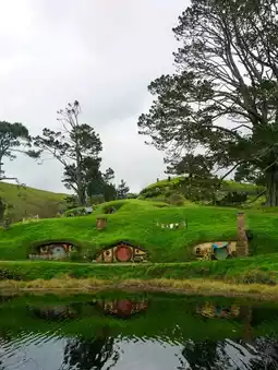 ⛺️🏕 This is the Hobbit village where The Lord of the Rings was filmed. Every corner is so adorable. The guide said that some of the big trees are fake, but most of the interior is fake, but you can hardly tell. It's like stepping into the movie. There's the brightly colored hobbit house, which even a small person like me could actually live in! 😆 There's a small flower garden, or at the Green Dragon Inn, you can enjoy a drink just like in the movie, as they offer a free glass of delicious ginger beer per person.