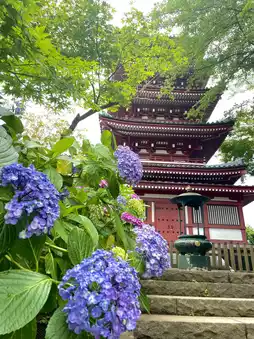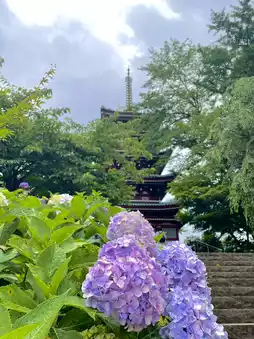 This is a popular photo spot where you can capture hydrangeas and the five-story pagoda.