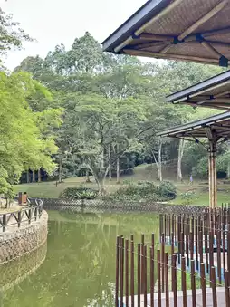 The building has a wavy curve and a beautiful lake spreads out before you.