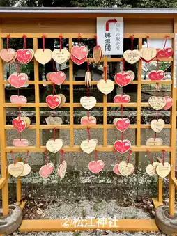 Heart-shaped votive plaques are sold at Kounkaku and Buratto Matsue Tourist Information Center.
