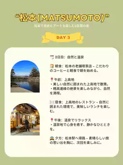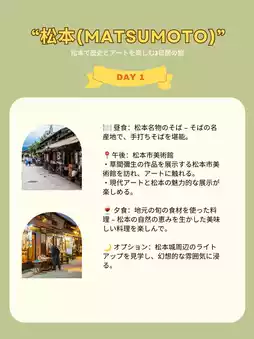 🚖 Evening: Stroll around Matsumoto – Enjoy the cultural atmosphere while walking through the beautiful streets.