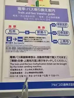 🚩 We booked tickets at the ALPICO building. The one-way ticket cost 3,000 yen, and we had to buy an additional train ticket at the station for 710 yen. The return trip totaled 3,710 yen, including both bus and train fares. From Matsumoto Station, take the train from platform 7 and transfer to a bus at Shin-Shimashima Station to reach Kamikochi.