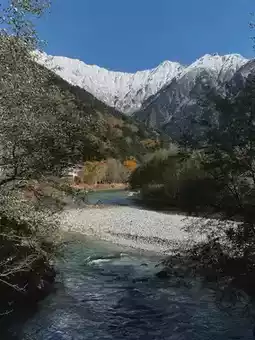 The water is as clear as a mirror, reflecting the green forest and mountains behind. It is as quiet as a painting. There is also a small shrine by the river.