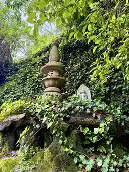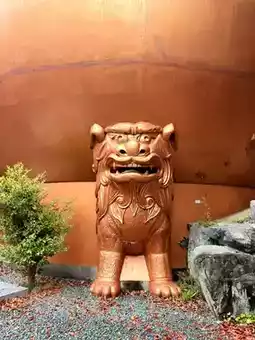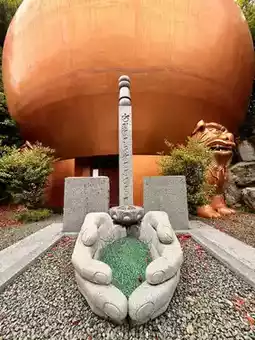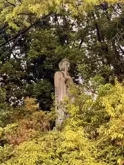 Continuing along the path from the cave entrance, I came across a mysterious structure—a golden onion-shaped pagoda guarded by two stone lions. Google Maps revealed that this place is called "Fudoki Hill - Mandala," which is part of Ishite-ji Temple but with a completely different style. A pair of hands holding marbles, with many scattered around, created a surreal atmosphere reminiscent of the scene in Spirited Away where one crosses a tunnel into another world.