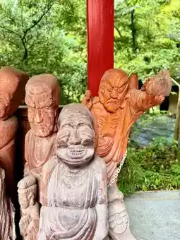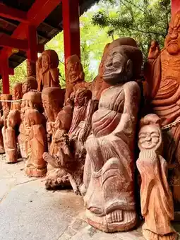 Inside the main hall, on the right, there is a wooden statue of an ascetic Buddha, depicting the state of the Buddha during his practice before enlightenment. Nearby are 500 Rakan statues with diverse expressions—joyful, wrathful, compassionate, and serene—forming a mysterious and surreal space.