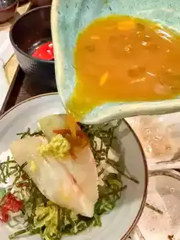 On the other hand, Matsuyama taimeshi is an elegant style in which sea bream fillets are placed on rice, poured over with hot dashi, and eaten like ochazuke.