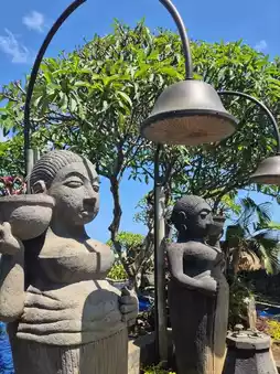 - Each room is an individual villa with a Balinese theme, so no big block of hotel rooms. The villa's are large, spacious with a huge 4 poster bed, walk-in wardrobe and a large ensuite with both sunken marble bath and separate shower (even their cheaper room has all the mentioned facilities.). Each room has either its own patio with sun loungers looking out over the gardens and sea, or its own enclosed garden with a private pool (depending on your room budget).