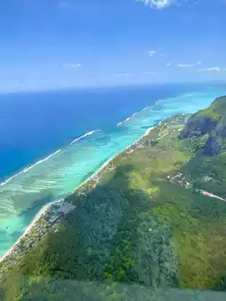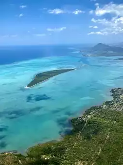 ✨ As you lift off, the scale of the island's beauty becomes clear. You'll soar over the lush, emerald-green peaks of the interior, spot the cascading ribbon of Chamarel Waterfall, and glide over the crystal-clear lagoons that shimmer in a thousand shades of blue and turquoise.