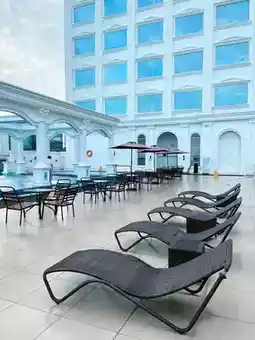 Perched on Level 7, Adimulia’s stunning infinity pool offers a truly mesmerizing experience. Surrounded by a lush green carpet and framed by panoramic city views, it’s a perfect spot for relaxation. The serene blue water stretches out into the skyline, creating a calming contrast with the urban backdrop.