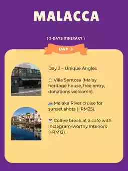 • 🚤 Melaka River cruise for sunset shots (~RM25).