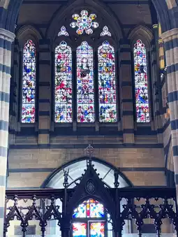 • Features: The striking contrast of sandstone and bluestone, spire, colored mosaic floor, and stained glass windows.