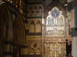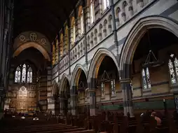 • Interior of the church: stained glass + wood carving + high vaulted roof, photographed very European feel.