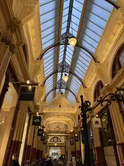 As night fell, I arrived at Block Arcade. This Victorian-style shopping arcade is breathtaking, with its mosaic tile floors, stained-glass dome, and intricate wrought-iron railings, each exuding a touch of vintage luxury. The arcade boasts a dazzling array of shops, from exquisite jewelry stores to artful bookshops to sweet shops wafting with enticing aromas. At one of these shops, I bought a piece of Lamington cake, a local specialty. The soft, fluffy cake, swirled with coconut flakes and filled with sweet jam, filled every bite with a sense of bliss.