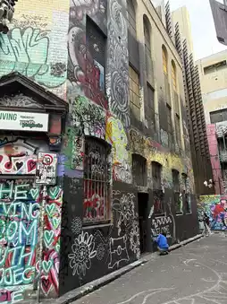 Crossing the square, I arrived at Hosier Lane, Melbourne's famous graffiti street. As soon as I stepped into the laneway, I was struck by the vibrant world of graffiti. The walls were covered in a dazzling array of styles, from exaggerated cartoon characters to profound text and abstract art. Each piece of graffiti was a unique expression of the artist's inner world. The clash of colors and the interweaving of lines made me feel like I was in a palace of imaginative art. Here, I witnessed artists at work. Their focused expressions and effortless brushstrokes deeply impressed me with the allure of street art. I kept snapping away, eager to capture each of these unique works of art.
