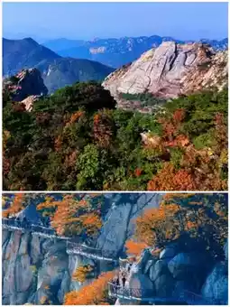 Yimeng Mountain Guimeng and Yunmeng Scenic Areas As the core scenic areas of Yimeng Mountain, the dazzling colors here and the fully dyed forests are known as the "magnificent benchmark of autumn scenery in Qilu!" The maple leaves spread across the mountains like a wildfire, with layers of orange-red, deep red, and scarlet leaves rolling in the autumn wind into a "red giant wave." It has the grandeur of "standing on the peak to overlook the red spreading across the sky," as well as the fairyland quality of "clouds and mist reflecting the red maples," fully displaying the majestic autumn charm of Yimeng's mountains and waters.