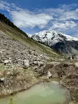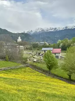 is a peaceful village nestled between white snow-capped mountains and medieval towers.