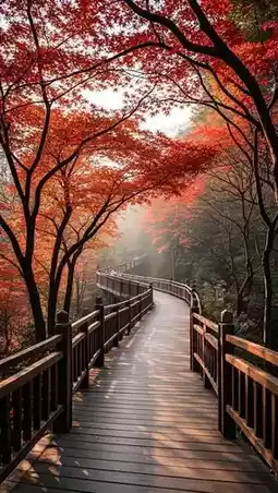 A 3-kilometer suspended wooden boardwalk winding through maple trees, most spectacular from late October to early November.
