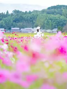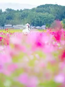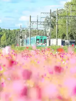 In front of the cosmos flowers swaying in the wind near the station