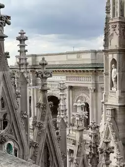 One of the highlights for me was climbing up to the rooftop terraces. From there, you’re not only surrounded by the forest of spires up close, but you also get sweeping views of Milan stretching out in every direction. It felt like being on top of both history and the city at once—a moment where the past and present truly meet.