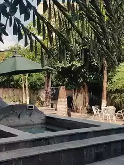 Swaying palm trees, outdoor hot spring pools, and stone slab baths—vacation mode fully activated.