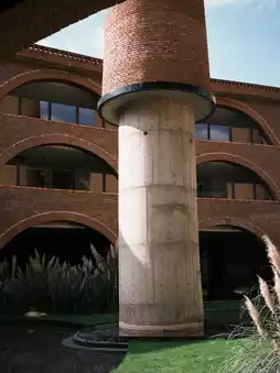 An irregular red brick building complex, the light and shadows at 4 PM are stunning! Side stairs + low-angle shots work best