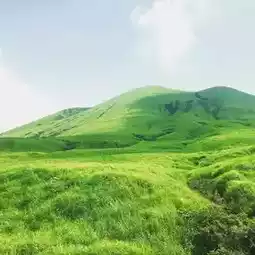 A vast grassland near Mount Aso, covered in vibrant green in summer and turning golden in autumn.