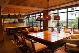 The lobby is mainly wooden in style. You can chat with friends and family here or choose to work here (there is Wi-Fi and sockets).