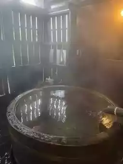 The barrel bath, located away from the main ryokan, is accessible via a narrow staircase. It had a charming atmosphere and even turned into a bubble bath, which was a delightful surprise! I enjoyed soaking in it at my leisure.