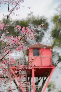 A Japanese-style wooden house surrounded by cherry blossoms🌸. When the wind blows, it feels like you're in Kyoto! Wear a Hanfu or a light-colored long dress for an instant atmospheric photo.