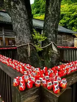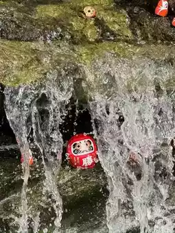 You’ll be amazed as soon as you enter the mountain gate! Under the eaves, beside the stone steps, on the water surface—Daruma dolls of all sizes are everywhere. Red, gold, tiny, giant... it’s said there are over a thousand in total. Each Daruma represents a worshipper’s wish, some even have cute expressions, making it perfect for photos.