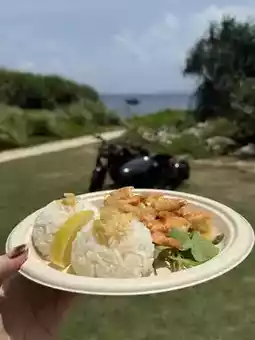 Fuel up with garlic-butter shrimp from **Harry’s Shrimp**, a bright orange food truck overlooking the sea. The shrimp is juicy, rich, and served hot with rice and tangy sauce. Grab a seat under the shade and take in panoramic views of the bridge and coastline while you eat.