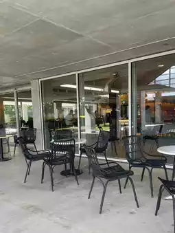 The concrete building has a simple exterior, but the interior has a warm atmosphere, including a dining area and a shop. ✨