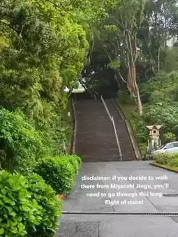 We walked from Miyazaki Jingu to the Peace Tower Park, it is.... (kind of walkable) especially since we were walking in some light rain, but there is this long flight of stairs that we had to go up - so an alternative is to take the bus up! But their frequency may be one bus per hour, so do check their schedule! Same for the buses leaving the park 😊