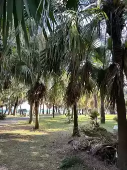 Emerging from the palm grove, you can see Aoshima Island right in front of you. The sound of the waves and the refreshing breeze create a soothing atmosphere.