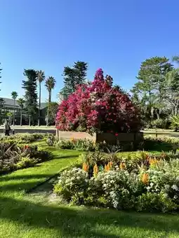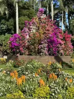 A 4-meter-tall, 7-meter-wide bougainvillea is in full bloom, and Washingtonia palms tower behind the flower spot.