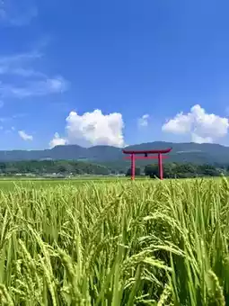 A crimson torii gate standing against a golden sea of rice ears—it's like time has stopped in this mystical scene. The historic Nio statues offer a soothing experience when you gently touch them, and the charmingly unique "Tanokansa" stone statues add a delightful touch. Encounter breathtaking views where the golden hues of early autumn blend seamlessly with ancient culture.