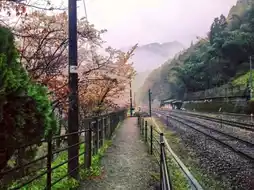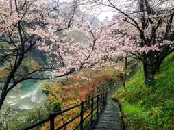On a drizzling April day when cherry blossoms were in full bloom, I visited Oboke in the Shikoku Mountains, a very quiet train station with few people. I crossed the railway and strolled along the Oboke Valley stream. Although it was drizzling, walking on the trail with an umbrella among the blooming cherry blossoms was also a romantic experience.