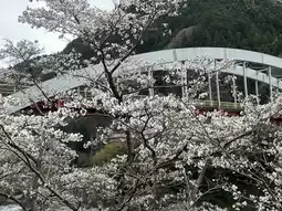 The scenery along the way is super beautiful, the mountains and rivers are reflected in the picture. After getting off the bus, there are cherry blossoms in full bloom in front of the station. Take a photo with the bridge, it is beautiful~