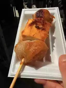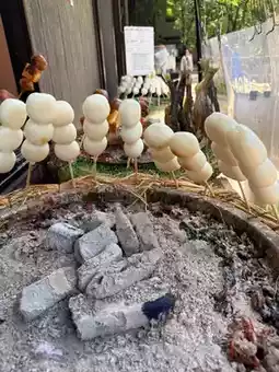 Next to the waterfall, there’s a shop selling grilled fish skewers and a unique snack called "dekomawashi" rotating puppet skewers. Made from taro, rock tofu, and konjac, these skewers resemble little puppets. Brushed with sweet miso and grilled by the hearth, they appear to dance as they cook. This simple snack is surprisingly delicious.